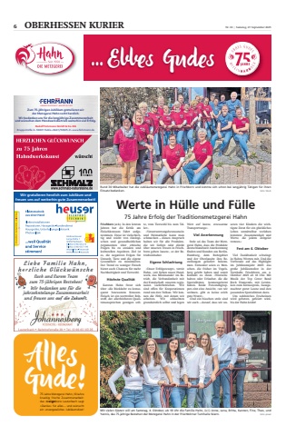 Werte in H%u00fclle und F%u00fclle75 Jahre Erfolg der Traditionsmetzgerei HahnFrischborn (eck). In den letztenJahren hat die Kritik amFleischkonsum Fahrt aufgenommen. Diese ist vielschichtig und reicht von %u00f6kologischen und gesundheitlichenArgumenten %u00fcber ethischeFragen bis zu sozialen undkulturellen Aspekten. Ziel istes, die negativen Folgen f%u00fcrUmwelt, Tiere und die eigeneGesundheit zu minimieren.Der Trend zu weniger Fleischbietet auch Chancen f%u00fcr mehrNachhaltigkeit und Tierwohl.H%u00f6chste Qualit%u00e4tKarsten Hahn freut sich%u00fcber %u00bbdie R%u00fcckkehr zu konsequent bewusstem Konsum.Fleisch ist ein wertvoller Rohstoff, der allerh%u00f6chsten Qualit%u00e4tsanspr%u00fcchen gen%u00fcgen sollte, vom Tierwohl bis zum Teller%u00ab.%u00bbVerantwortungsbewusstseinund Heimatliebe kann manschmecken %u2013 diesen Anspruchhalten wir f%u00fcr alle Produkte,die wir liefern oder direkt%u00fcber unseren Tresen in Frischborn gehen lassen%u00ab, so der Betriebsinhaber.Eigene Schlachtung%u00bbUnser Erfolgsrezept%u00ab, verr%u00e4tHahn, %u00bbwir lieben unser Handwerk, das Miteinander im Betrieb, die Verbundenheit mitder Kundschaft, unseren regionalen Lieferbetrieben. Wirsind offen f%u00fcr Kooperationenrund um den Vulkan. Wir kennen die H%u00f6fe, mit denen wirarbeiten. Wir schlachtengrunds%u00e4tzlich selbst und legenWert auf kurze, stressarmeTransportwege%u00ab.Viel AnerkennungStolz sei das Team der Metzgerei Hahn, dass die Produktedeutschlandweit Anerkennungfinden und Kunden aus Berlin,Hamburg, dem Ruhrgebietund der Oberlausitz ihre Bestellungen geliefert bekommen. Entweder seien es Menschen, die fr%u00fcher im Vogelsberg gelebt haben und somitKontakt zu ihren %u00bbWurzeln%u00abhalten oder Urlauber, die dieSpezialit%u00e4ten kennengelernthaben. Beide Personengruppen eint eine Ansicht, %u00bbwo wirwohnen, gibt es keine solchgute Wurst%u00ab.%u00bbUnd ein bisschen stolz sindwir auch %u2013 darauf, dass wir unseren vier Kindern die wichtigste Zutat f%u00fcr ein gl%u00fccklichesLeben unmittelbar vorlebenkonnten: Zusammenhalt undWerte, die jedem Zeitgeisttrotzen.%u00abFest am 4. OktoberViel Dankbarkeit schwingtin Hahns Worten mit. Und dieVorfreude auf das Highlightim Jubil%u00e4umsjahr 2025: dasgro%u00dfe Jubil%u00e4umsfest in derTurnhalle Frischborn am 4.Oktober 2025 ab 18 Uhr. MitMusik der Top Cover BandRock Diamonds, mit Getr%u00e4nken zum Kirmespreis, hausgemachter guter Laune und denpassenden Spezialit%u00e4ten dazu.Um zahlreiches Erscheinenwird gebeten, gefeiert wird,bis der Hahn kr%u00e4ht!Rund 30 Mitarbeiter hat die Jubil%u00e4umsmetzgerei Hahn in Frischborn und konnte sich schon bei langj%u00e4hrig T%u00e4tigen f%u00fcr ihrenEinsatz bedanken. Foto: StockMit vielen G%u00e4sten will am Samstag, 4. Oktober, ab 18 Uhr die Familie Hahn, (v.l.) Anne, Lena, Britta, Karsten, Fine, Theo, undYannis, das 75-j%u00e4hrige Bestehen der Metzgerei Hahn in der Frischb%u00f6rner Turnhalle feiern. Foto: privat%u2026Ebbes Gudes75 Jahre Metzgerei Hahn,10 Jahreknackig frische Zusammenarbeit:das designb%u00fcro Lauterbach sagt%u00bbDanke%u00ab f%u00fcr alles %u2013 und w%u00fcnschtein unvergessliches Jubil%u00e4umsfest!Gude!%ufffdAllesbe Familie Hahn,he r z liche Gl%u00fcckw%u00fcnsch eEuch und Eurem Teamzum 75-j%u00e4hrigen Bestehen!Wir bedanken uns f%u00fcr diejahrzehntelange Zusammenarbeitund freuen uns auf die Zukunft.Lauterbach . . Bahnhofstra%u00dfe 39 Tel. (0 66 41) 40 26Liebhe r z lauf die ZukunftL b 41) 40 26Wir gratulieren herzlich zum Jubil%u00e4um undfreuen uns auf weiterhin gute Zusammenarbeit!HERZLICHEN GL%u00dcCKWUNSCHzu 75 JahrenHahndwerkskunst w%u00fcnschtRudolf Fehrmann GmbH & Co. KGKruppstra%u00dfe4%u202236041 Fulda %u2022 0661/92825-0 %u2022 www.fehrmann.deZum 75-j%u00e4hrigen Jubil%u00e4um gratulieren wirder Metzgerei Hahn recht herzlich.Wir bedanken uns f%u00fcr die langj%u00e4hrige Zusammenarbeitund w%u00fcnschen dem Handwerksbetrieb weiterhin viel Erfolg.6 OBERHESSEN KURIER Nr. 39|Samstag, 27. September 2025