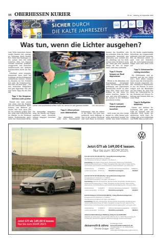 Was tun, wenn die Lichter ausgehen?(red). Tr%u00fcbe Aussichten: Immerwieder funzeln sich %u00bbein%u00e4ugige%u00ab Fahrzeuge durch Dunkelheit, Nebel und Starkregen. Jedes sechste Auto fiel beimLicht-Test 2024 von Zentralverband Deutsches Kraftfahrzeuggewerbe und DeutscherVerkehrswacht mit defektenScheinwerfern durch das Raster.Erhellend, wenn entgegenkommende Autos dann mitLichthupe auf den Schlamasselaufmerksam machen. Schnelles Handeln tut Not. Schlie%u00dflich steht die Verkehrssicherheit aller auf dem Spiel %u2013 vonden drohenden Bu%u00dfgeldernmal ganz abgesehen. Was alsotun? Sechs Tipps f%u00fcr den Notfall.Tipp 1: Vor l%u00e4ngerenFahrten Licht pr%u00fcfenEinmal ums Auto sausenund schon sind die Funktionen von Scheinwerfern, R%u00fccklichtern und Blinkern gecheckt. Wer noch etwas Zeitbis zur n%u00e4chsten gro%u00dfen Tourhat, sollte zum Licht-Sicht-Testim Oktober in die Werkstattfahren. Professioneller geht%u2019snicht. Der Check kostet nichts.Die notwendige Instandsetzung, der Einsatz von Diagnoseger%u00e4ten sowie Ersatzteilem%u00fcssen hingegen berechnetwerden.Tipp 2: Alternativenzum AbblendlichtDas Abblendlicht strahltnicht mehr. Ersatzlampen?Fehlanzeige! Und das mittenin der Nacht. Um zum Lampentausch noch halbwegs sicher in die n%u00e4chste Werkstattoder nach Hause zu kommen,k%u00f6nnen das Standlicht oderbei schlechter Sicht die Nebelscheinwerfer kurzzeitig eineAlternative sein. Letztere d%u00fcrfen allerdings nur bei Sichtweiten unter 50 Metern strahlen. Dann gilt auch maximalTempo 50. Wer sie l%u00e4ngernutzt, zahlt eine Geldstrafe.Tipp 3: Ersatzlampen an BorddeponierenPflicht ist die Mitnahme vonErsatzlampen hierzulandenicht. F%u00fcr Fahrzeuge mit Halogenlampen und sogenanntenRetrofit-LEDs macht sie allerdings Sinn. Denn auch Laienk%u00f6nnen sie mit etwas Geschick tauschen. Anders Xenon- und viele LED-Lampen %u2013die m%u00fcssen in der Werkstattgewechselt werden.Tipp 4: Lampenimmer paarweisetauschenAuch wenn nur eine Lampekaputt ist, sollte immer paarweise gewechselt werden. DieGefahr, dass beide Scheinwerfer die Stra%u00dfe ungleichm%u00e4%u00dfigbeleuchten, der Gegenverkehrgeblendet wird oder vermeintlich ein Motorrad sichtet, istgro%u00df. Und mit Sicherheitgibt die noch funktionierendeLampe auch bald ihren Geistauf.Tipp 5: Scheinwerferrichtig einstellenDie Gl%u00fchlampen sind gewechselt und gut ist? Sch%u00f6nw%u00e4r%u2019s. Nach jedem Lampentausch muss die Scheinwerferh%u00f6he korrekt eingestellt werden. Strahlen sie beispielsweise nur ein Prozent zu hoch,steigert sich das Blendrisikoum den Faktor 20. Auch hierbietet der Licht-Sicht-Test inder Werkstatt mit Wissen, Erfahrung und Technik Hilfe auserster Hand.Tipp 6: Bu%u00dfgelderbeachtenFahren mit defekter Beleuchtung oder ganz ohneLicht im Dunkeln oder beischlechter Sicht kostet beispielsweise 48,50 Euro. Zuschl%u00e4ge gibt es bei Gef%u00e4hrdungund Unfall. Muss ja nicht sein.Lichter und Leuchtmittel sollten nicht nur einmal im Jahr getestet werden. Foto: Hella GutmannJetzt GTI ab 169,00 %u20ac leasenNur bis zum 30.09.2025 IhrVolkswagenPartnerDeisenroth & S%u00f6hne GmbH & Co. KGSchwabenr%u00f6der Str. 64, 36304 Alsfeld06631 / 796-0volkswagen.alsfeld@autohaus-deisenroth.deJetzt GTI ab 169,00 %u20ac leasen.Nur bis zum 30.09.2025.Polo GTI 2.0 TSI 152 kW (207 PS), 7-Gang DSG AutomatikgetriebeEnergieverbrauch kombiniert 6,5 l/100 km;CO2-Emissionen kombiniert 148 g/km; CO2-Klasse EAusstattung: LED-Matrix-Scheinwerfer, Klimaanlage, Sitzheizung, Einparkhilfe,Verkehrszeichenerkennung, 17%u201c R%u00e4der, Navigation %u00fcber App-Connect, Apple CarPlay,Android Auto, dynamischer Fernlichtassistent, Fahrprofilauswahl, und vieles mehr...Golf GTI 2.0 TSI 195 kW (265 PS), 7-Gang DSG AutomatikgetriebeEnergieverbrauch kombiniert 7,1 l/100 km;CO2-Emissionen kombiniert 161 g/km; CO2-Klasse FAusstattung: LED-Plus-Scheinwerfer, Klimaautomatik, Einparkhilfe, R%u00fcckfahrkamera,Verkehrszeichenerkennung, 17%u201c R%u00e4der, Navigation via App-Connect, Apple CarPlay,Android Auto, Fernlichtassistent, automatische Distanzregelung ACC, und vieles mehr...Inklusive Erlebnisabholung in Wolfsburg. G%u00fcltig bis zum 30.09.2025.Angebote der Volkswagen Leasing GmbH, Gifhorner Str. 57, 38112 Braunschweig, f%u00fcrPrivatkunden. Bonit%u00e4t vorausgesetzt. Abbildung zeigt ggf. Sonderausstattungen.Sonderzahlung:Laufzeit (anpassbar):J%u00e4hrliche Fahrleistung (anpassbar):Monatliche Leasingrate:1.490,00 %u20ac30 Monate10.000 km169,00 %u20acSonderzahlung:Laufzeit (anpassbar):J%u00e4hrliche Fahrleistung (anpassbar):Monatliche Leasingrate:1.490,00 %u20ac24 Monate10.000 km265,00 %u20acGolf GTI Clubsport 2.0 TSI 221 kW (300 PS), 7-Gang DSG AutomatikgetriebeEnergieverbrauch kombiniert 7,3 l/100 km;CO2-Emissionen kombiniert 167 g/km; CO2-Klasse FAusstattung: LED-Plus-Scheinwerfer, Klimaautomatik, Einparkhilfe, R%u00fcckfahrkamera,Verkehrszeichenerkennung, 18%u201c R%u00e4der, Navigation via App-Connect, Apple CarPlay,Android Auto, Fernlichtassistent, automatische Distanzregelung ACC, und vieles mehr...Sonderzahlung:Laufzeit (anpassbar):J%u00e4hrliche Fahrleistung (anpassbar):Monatliche Leasingrate:1.490,00 %u20ac24 Monate10.000 km289,00 %u20ac15 OBERHESSEN KURIER Nr. 38|Samstag, 20. September 2025