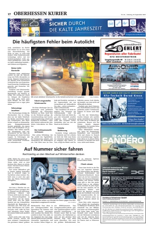 17 OBERHESSEN KURIER Nr. 38|Samstag, 20. September 2025Auf Nummer sicher fahrenRechtzeitig an den Wechsel auf Winterreifen denken(ZDK). Haben Sie schon einenTermin f%u00fcr den R%u00e4derwechsel?Wenn nicht, wird es jetzth%u00f6chste Zeit, diesen zu vereinbaren. Und den besten Winterreifen zu w%u00e4hlen.Den ersten Bodenfrost gabes bereits Anfang Septemberund in h%u00f6heren Lagen istNachtfrost schon normal. Deshalb w%u00e4re es jetzt eine guteIdee, das Thema Winterreifenanzugehen.Auf Alter achtenSeit dem 1. Oktober des vergangenen Jahres gen%u00fcgen %u00e4ltere Gummis mit der M+S-Kennzeichnung (Matsch undSchnee) nicht mehr der situativen Winterreifenpflicht inDeutschland. Auf der Seitenwand muss nun das AlpinSymbol mit der Schneeflockeinnerhalb der Bergzacken zuerkennen sein. Wer noch mitalten M+S-Puschen bei Gl%u00e4tteerwischt wird, zahlt 60 Euround bekommt einen Punkt,bei einem Unfall auch deutlichmehr.Doch wenn man nun neueReifen braucht, welche sollman nehmen? Ganzjahresreifen gewinnen immer gr%u00f6%u00dfereMarktanteile. Dass diese inden Fahreigenschaften denSpezialisten f%u00fcr Sommer undWinter jeweils unterlegensind, nehmen ihre K%u00e4ufer wissentlich in Kauf. Was z%u00e4hlt, istdas Argument der zwei eingesparten R%u00e4derwechsel j%u00e4hrlich,eventueller Lagerkosten unddes zweiten Satzes Felgen sowie RDKS-Sensoren. DassGanzjahresreifen jedoch %u2013 gleiches Qualit%u00e4tssegment und Dimension vorausgesetzt %u2013 30Prozent teurer sind als Sommerreifen, die Haltbarkeit jedoch um den gleichen Wertdarunter liegt, wird dabeimeist %u00fcbersehen. Wie auchder gr%u00f6%u00dfere Rollwiderstand,der zu h%u00f6herem Spritverbrauch f%u00fchren kann.Check ratsamUnter dem Strich ist der Einsatz von separaten Sommerund Winterreifen laut Bundesverband Reifenhandel undVulkaniseur-Handwerk kaumteurer als ein Satz Ganzjahresreifen. Die besseren Fahreigenschaften und k%u00fcrzere Bremswege gibt es also fast gratis.Zudem kann es nie schaden,wenn zweimal im Jahr Experten das Auto ansehen, bei abmontierten R%u00e4dern auchgleich die Bremsen checkensowie die Profiltiefe. Erst rechtbei Ganzjahresreifen, die vorallem im Sommer unter wesentlich h%u00f6herem Abrieb leiden.Denn bitte nicht vergessen:Zwar erlaubt der Gesetzgeber1,6 Millimeter Profiltiefe, dochunterhalb von vier Millimetern kann von Wintertauglichkeit keine Rede mehr sein.Deshalb: Jetzt einen Terminmit der Werkstatt vereinbarenund auf die sicherste Bereifung wechseln. Von Oktoberbis Ostern sind es Winterreifen.Sommerreifen sollten von Oktober bis Ostern gegen ihre Winterpendants ausgetauscht werden. Foto: ProMotorDie h%u00e4ufigsten Fehler beim Autolicht(red). Autofahren im Herbstund Winter ist an sich schoneine Herausforderung. DieSicht ist mau, es wird fr%u00fchdunkel. Ohne funktionierendeLichtanlage sieht%u2019s mit derVerkehrssicherheit tr%u00fcbe aus.Umso gef%u00e4hrlicher, wenn Fahrer dann un%u00fcberlegt handeln %u2013mit Fehlern wie folgenden.Keine LichtKontrolleExperten raten, mindestenseinmal im Jahr die Beleuchtung von Profis %u00fcberpr%u00fcfen zulassen. Bequem beispielsweiseim Oktober beim kostenlosenLicht-Sicht-Test von Zentralverband Deutsches Kraftfahrzeuggewerbe und Deutscher Verkehrswacht.Funktion und Scheinwerfereinstellung werden gepr%u00fcft,Reparaturen auf Wunsch erledigt. Wie wichtig der Checkist, belegen die Ergebnissevon 2024: Jedes vierte Autohatte M%u00e4ngel, bei den Nutzfahrzeugen war es sogar jedesdritte.SchmutzigeLeuchtenDie Waschanlage erledigt dieDrecksarbeit. Das ist richtig,aber nur die halbe Wahrheit.Im Herbst und Winter mutieren Scheinwerfer und R%u00fccklichter schnell zu Schmutzf%u00e4ngern. Entgegenkommendewerden geblendet, die eigeneSicht und Sichtbarkeit ist gemindert. Hier helfen zus%u00e4tzliche Waschg%u00e4nge und zwischendurch vor der Fahrt dieReinigung mit einem feuchtenLappen. In Fahrzeugen mitScheiben-Reinigungsanlagesollte ausreichend Wischwasser vorhanden sein.Falsch eingestellteScheinwerferDie Krux %u00fcberhaupt: Der Gegenverkehr wird gef%u00e4hrlichgeblendet, die Verursacherverlieren an Sicht. Auch hierist die Werkstatt gefragt, dieGrundeinstellung und Leuchtweitenregulierung schnell undfachgerecht vornimmt %u2013 ebenfalls einfach w%u00e4hrend der j%u00e4hrlichen Licht-Aktion im Oktober.Der LichtautomatikvertrauenEine prima Erfindung: AmTag strahlt das Tagfahrlicht,bei D%u00e4mmerung schaltet sichautomatisch das Abblendlichtein. Und f%u00e4hrt man im Dunkeln mit Fernlicht, wechselt esbei Gegenverkehr wie vonGeisterhand auf Abblendlicht.Das alles %u2013 sofern vorhanden %u2013dank Lichtautomatik.Was Autofahrer oft nicht bedenken: Die Sensoren derLichtautomatik sind beischlechter Sicht wie Nebel, Regen oder Schneefall sensibel,reagieren dann manchmalnicht oder versp%u00e4tet. Sicherheitshalber also ran mit derHand an die Schalter.FalscheBedienungFernlicht bringt au%u00dferortsim Dunkeln und bei schlechter Sicht die Welt zum Strahlen. Kommen andere Fahrzeuge entgegen oder fahren voraus, steigt das Blend- und Unfallrisiko enorm. Grob fahrl%u00e4ssig handelt, wer jetzt nicht aufAbblendlicht dimmt.Faulheit oder doch Unkenntnis? Nicht-Blinken irritiert undgef%u00e4hrdet andere Verkehrsteilnehmer. Es kostet auch Bu%u00dfgeld.Am Rot der Nebelschlussleuchte k%u00f6nnen sich nachfolgende Autofahrer bei schlechter Sicht unter 50 Metern gutorientieren. Bessert sich dasWetter, besteht dagegenBlendgefahr. Die Leuchte mussausgeschaltet werden.Ohne Abblendlicht erscheinen Autos bei D%u00e4mmerung,Dunkelheit und miserablerSicht und ebenso in Tunnelswie Geisterfahrzeuge. Tagfahrlicht allein ist in diesen F%u00e4llenverboten. Es leuchtet nur nachvorn, nicht nach hinten.Mit einem defekten Scheinwerfer ist die Verkehrssicherheit nicht gegeben Foto: ProMotorSANDEROJetzt mit kostenlosen Winterkomplettr%u00e4dern f%u00fcr denDacia Sandero*schon ab 130,16 %u20ac%u00b9 leasenDacia Sandero TCe 90: Gesamtverbrauch kombiniert(l/100 km): 5,3; CO2-Emissionen kombiniert (g/km): 119; CO2-Klasse: D.%u00b9 Leasing: Da