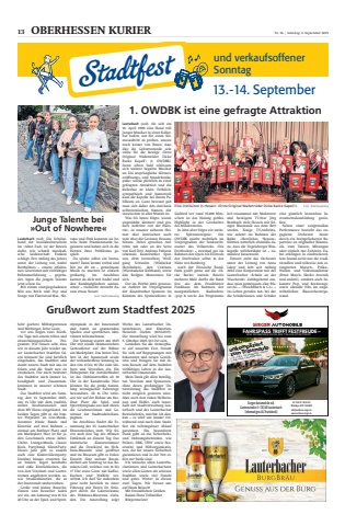 Gru%u00dfwort zum Stadtfest 2025Sehr geehrte Mitb%u00fcrgerinnenund Mitb%u00fcrger, liebe G%u00e4ste,vor uns liegen zwei feierliche Tage mit einem tollen undabwechslungsreichen Programm: Wir freuen sehr, dasswir in diesem Jahr wieder unser Lauterbacher Stadtfest feiern k%u00f6nnen! Sie sind herzlicheingeladen, das Stadtfest unddamit unsere Stadt mit uns zufeiern und die Stadt neu zuentdecken. F%u00fcr mich bedeutetdas Stadtfest auch immer Lebendigkeit und Zusammenkommen in unserer sch%u00f6nenStadt.Das Stadtfest wird am Samstag, den 13. September 2025,um 14 Uhr mit dem traditionellen Fassbieranstich unddem MV Horas eingel%u00e4utet. Anbeiden Tagen gibt es ein buntes Potpourri an Live-Musik,darunter lokale Bands undK%u00fcnstler, auf zwei B%u00fchnen %u2013einmal am Berliner Platz undam Marktplatz. Hier ist f%u00fcr jeden Geschmack etwas dabei:Ch%u00f6re, Lounge-Musik, ClassicRock, Partyband, Silent-Party.Dieses Jahr gibt es zudemauch eine Kinder-Silentparty.Dar%u00fcber hinaus erwarten Siean beiden Tagen herzhafteund s%u00fc%u00dfe K%u00f6stlichkeiten, dievon den Vereinen und Gastronomen angeboten werden, sowie Stra%u00dfenk%u00fcnstler, die inder Innenstadt umherziehen.Gro%u00dfe und kleine Besucherinnen und Besucher ladenwir ein, am Samstag von 16 bis20 Uhr an der Spiel- und Sportolympiade in der Innenstadtund damit an spannendenSpielen und sportlichen Aktivit%u00e4ten teilzunehmen.Der Sonntag startet um 10.15Uhr mit einem %u00f6kumenischenGottesdienst auf der B%u00fchneam Marktplatz. Das bunte Treiben in der Innenstadt sowieder verkaufsoffene Sonntag laden von 12 bis 18 Uhr zum St%u00f6bern und Verweilen ein. EinH%u00f6hepunkt f%u00fcr Autoliebhaberist das Oldtimertreffen ab 10Uhr in der Kanalstra%u00dfe. Hierk%u00f6nnen Sie die gro%u00dfe Sammlung nostalgischer Fahrzeugebewundern. Ab 14 Uhr verlosen wir auf der B%u00fchne am Berliner Platz die Spiel- undSportolympiade aus und ehrendie Gewinnerinnen und Gewinner der Stadtradeln-Kampagnen.Im Anschluss findet die Ernennung des 33. LauterbacherEhrenstrolches statt. Wir feiern auch den Tag des offenenDenkmals an diesem Tag: Dashistorische Klassenzimmerund die Druckerei im Hohhaus-Museum sind ge%u00f6ffnetund im Museum gibt es freienEintritt. Eine weitere Besonderheit am Sonntag ist das Remisen-Caf%u00e9, welches von 14 bis17 Uhr seine G%u00e4ste mit Kaffee,Kuchen und Waffeln verw%u00f6hnt. Ich darf Sie au%u00dferdemganz recht herzlich zu einerF%u00fchrung mit Herrn Dr. Kniepert durch die Galerier%u00e4umedes Hohhaus-Museums einladen. Die Ausstellung zeigtWerke des Lauterbacher Unternehmers und K%u00fcnstlersHeinrich Diehm (1853-1917).Die Ausstellung wird bis zum5. Oktober 2025 vor Ort sein.Genie%u00dfen Sie die Atmosph%u00e4re auf unserem Fest, freuenSie sich auf Begegnungen mitbekannten und neuen Gesichtern und bringen Sie mit ihrem Besuch auf dem Stadtfestvielf%u00e4ltiges Leben in die Lauterbacher Innenstadt.Mein Dank gilt allen beteiligten Vereinen und Sponsoren,ohne deren gro%u00dfz%u00fcgiger Unterst%u00fctzung das Stadtfest sonicht m%u00f6glich gewesen w%u00e4re.Aber auch den vielen Helferinnen und Helfer, auch innerhalb der Stadtverwaltung Lauterbach und des LauterbacherBetriebshofes, m%u00f6chte ich danken %u2013 es wird wie immer vor,w%u00e4hrend und nach dem Stadtfest ein reibungsloser Ablaufgarantiert. Ein besondererDank geht an die Sicherheitsund Ordnungsbeh%u00f6rden, wiePolizei, DRK, THW sowie Feuerwehr und Hilfsorganisationen, die f%u00fcr unsere Sicherheitgarantieren und in der Not sofort zur Stelle sind.Ich w%u00fcnsche allen Lauterbacherinnen und Lauterbachernsowie allen G%u00e4sten ein sch%u00f6nesStadtfest sowie viel Freudeund gutes Wetter in diesenzwei Tagen. Wir freuen unsauf Ihren Besuch!Mit freundlichen Gr%u00fc%u00dfenRainer-Hans Vollm%u00f6llerB%u00fcrgermeister1. OWDBK ist eine gefragte AttraktionLauterbach (red). Als sich am18. April 1999 eine Hand volljunger Musiker in einer Kellerbar trafen, um f%u00fcr einen Kirmesauftritt zu proben, wusstenoch keiner von ihnen, dassdies die Geburtsstunde seinsollte f%u00fcr die heutige %u00bbErsteOriginal Wallenr%u00f6der DickeBacke Kapell%u2019%u00ab (1. OWDBK).Denn schon bald schlossensich weitere begabte Musikeran. Die urspr%u00fcngliche %u00bbKirmeser%u00f6ffnungs- und St%u00e4ndchenkapelle%u00ab wurde pl%u00f6tzlich zu einergefragten Attraktion und dieKellerbar zu klein. Fr%u00f6hlich,sympathisch und humorvollkam die Kapelle bei ihrem Publikum an. Ganz bewusst gabman sich daher den durchausselbstironischen Namen, derinzwischen in aller Munde ist.Was bis heute folgte, warenungez%u00e4hlte kleinere und gr%u00f6%u00dfere Auftritte %u00bbvor der Haust%u00fcr%u00ab, in unserer n%u00e4heren Heimat aber inzwischen auchweit %u00fcber die Grenzen Hessenshinaus. Dabei sprechen Auftritte mit oder an der Seitevon Karl %u00d6rtl, Andreas Fulterer(ehemals Kastelruther Spatzen, 2016 verstorben), Wolfgang Schwalm (WildeckerHerzbuben), den Crackers(Wiesbadener Kultband), sowieden Rodgau Monotones f%u00fcrsich.Der im Herbst 2013 genossene Auftritt im Vorprogrammder %u00bbKastelruther Spatzen%u00ab imRahmen des Spatzenfestes inS%u00fcdtirol vor rund 15.000 Menschen ist das bislang gr%u00f6%u00dfteHighlight in der Geschichtedes Musikvereins.In 2014 aber folgte ein weiteres Spitzenereignis: DieOWDBK spielte mehrfach imVorprogramm der Senkrechtstarter des Volksrocks %u00bbDieDorfrocker%u00ab %u2013 zweimal gar imRahmen des Open Air-Festivalsder Dorfrocker selbst in derN%u00e4he von Bamberg.Auch der Hessische Rundfunk greift gerne auf die %u00bbDicke Backe%u00ab zur%u00fcck: Bereitsmehrere Male durfte die Bandlive aus dem FrankfurterFunkhaus im Rahmen dermorgendlichen Radioshow%u00bbpop & weck%u00ab des Programmshr3 zusammen mit Moderatorund heutigem TV-Star J%u00f6rgBombach viele Hessen mit fetziger Blasmusik aus dem Bettwerfen. Einige TV-Auftritte,wie zuletzt im Rahmen derReihe %u00bbHerrliches Hessen%u00ab,f%u00fchrten nat%u00fcrlich ebenfalls dazu, dass die Vogelsberger Blaskapelle welt