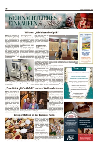 19 Freitag, 5. Dezember 2025 ANZEIGEin AlsfeldWEIHNACHTLICHESEINKAUFENFeiertage:25. & 26.12.2025geschlossenStadtb%u00e4ckerei %u00b7 Konditorei %u00b7 Cafe RahnZum Fest: Unsere hauseigenenPl%u00e4tzchen in verschiedenstenVariationen, sowie Adventsbrotim Mainzer Tor 6&Jahnstrasse 33GeschenkevielfaltVerschenken Sie unsere s%u00fc%u00dfenHonig-Lebkuchenfiguren,weihnachtliche Pralinen,Rahns Fr%u00fchst%u00fccksgutscheine& Weihnachtstassen.Wir empfehlen:Unser hauseigenesTeegeb%u00e4ck festlich verpacktWeihnachts-Angebot:1 St%u00fcck Gew%u00fcrzkuchen+ 1 Tasse Kaffeenur 6,95 %u20acDEIN BAD AN M%u00d6GLICHKEITENSchenk%u2018 den Liebsten was wirklich Gutes!Zeit zum Durchatmen,Abtauchen und Auftanken!Mit Gutscheinen oder Mehrfachkartenf%u00fcr das Alsfelder Erlenbad%u2013 Hallenbad, Freibad, Sauna & Grotte %u2013verschenkst du Entspannung,Wellness & Gesundheit in einem!Erlenbad Alsfeld -verschenken,was gl%u00fccklich macht.Zum Gl%u00fcckgibt%u00b4s AlsfeldEin Reisef%u00fchrerf%u00fcr frische G%u00e4ste& alte HasenNoch Platz untermWeihnachtsbaum?Dezember-Aktion:Zum Buch gibt%u00b4s einPostkartenset gratis!Erh%u00e4ltlich im BuchladenLesenswertAlsfeld %u2013 Seit 34 Jahren ist Michael Wirkner in der Optikbranche ein Begriff. Als zertifiziertes Sehexperten-Zentrumsteht der High-End-Optiker f%u00fcrmodernste Technik und h%u00f6chsteQualit%u00e4t.Im Bereich Optik ist neben einer Vielfalt an modernen Brillenfassungen die umfassendeGesundheitsvorsorge f%u00fcr dasAuge besonders hervorzuheben%u2013speziellimBereichgrauerStar (Katarakt), gr%u00fcner Star(Glaukom)oderMakuladegeneration (AMD). Das digitale Augen-Screening kann auch alsWeihnachtsgutschein verschenktwerden.Full-ServicebeiderGesundheitsvorsorgeUm seine Kunden in Sachenaugenmedizinische Vorsorgenoch besser unterst%u00fctzen zuk%u00f6nnen, hat Michael Wirknerdas Angebot mit einer neuenFunduskamera weiter aufger%u00fcstet.Der erfahrene Optiker versteht sich als wichtige VerbindungzwischenKundenundAugen%u00e4rzten, um die bestm%u00f6gliche Versorgung zu gew%u00e4hrleisten.Mit dem hochtechnischenGer%u00e4t kanner denAugen%u00e4rztenzuarbeiten, um Kunden langfristig beim Erhalt ihrer Sehkraft zu unterst%u00fctzen.Ein besonderes Highlight imSortiment sind die elektronischen Brillen, die sowohl H%u00f6ren als auch Sehen kombinieren.Angebotswochenbis10 Januar %u2013bis zu250 Euro sparenOb Eyescreen%u00ae-Brillengl%u00e4ser,Eyedrive%u00ae-Brillengl%u00e4ser oderSportbrillen in Sehst%u00e4rke mitEinst%u00e4rken- oder Gleitsichtgl%u00e4sern: Bei den Angebotswochenlassen sich bis zum 10. Januarbis zu 250Eurosparen.Dabei gilt: Sechs MonateGeld-zur%u00fcck-Garantie bei Unvertr%u00e4glichkeit, zwei Jahre Garantie auf die gesamte Brille inklusive Fassung und Gl%u00e4ser,zwei Jahre Garantie bei Bruch,Verlust oder Diebstahl sowiesechs Monate Zweitbrillen-Bonus: 50 % Rabatt auf die Zweitbrille.Wirkner bietet auch ein Kontaktlinsen-Abo ohne zeitlicheBegrenzungan.Im Bereich Schmuck und Uhren pr%u00e4sentiert Wirkner eineausgew%u00e4hlte Kollektion an Ringen, Ketten und Ohrsteckernaus Silber und Edelstahl %u2013 sei esf%u00fcr einen selbst oder als Geschenkf%u00fcr die Liebsten.Ob Uhren, Armb%u00e4nder oderexklusive Marken, das Sortimentist vielf%u00e4ltigundindividuell gestaltbar.Kunden werden bei der Auswahl von fachkundigem Personal unterst%u00fctzt, um das perfekte St%u00fcck zu finden. Zum TopTeam z%u00e4hlen f%u00fcnf Mitarbeiterinnen und ein Auszubildender.Verlobungs- und Trauringeaus Silber,Gold und Platin k%u00f6nnen zudem individuell %u00fcberden Trauring-Konfigurator gestaltet werden, wobei das Teamsich viel Zeit f%u00fcr eine pers%u00f6nliche Beratungnimmt. wiaAls zertifiziertes Sehexperten-Zentrum steht der High-EndOptiker Wirkner f%u00fcr modernste Technik und h%u00f6chste Qualit%u00e4t. WINDUSNeben einer Vielfalt an modernen Brillenfassungen ist dieumfassende Gesundheitsvorsorge f%u00fcr das Auge besondershervorzuheben. WINDUSWirkner: %u201eWir leben die Optik%u201cAlsfeld%u2013 %u201eZumGl%u00fcckgibt%u2019sAlsfeld%u201c%u2013Das wissen alle, die Alsfeld kennen und lieben. Ausdiesem Grund haben JohannaMildner, Traudi Schlitt und JennyWagner indiesemJahr ihrenneuen Alsfeld-Guide mit genaudiesem Titel herausgebracht:bunt,frisch und mit allem, wasAlsfeld-Fans und solche, die eswerden wollen, wissen m%u00fcssen.Das fast 200-seitige Buch gibtnicht nur praktische Tipps zu%u00dcbernachtungen, Essen undShoppen, sondern hat viele,reich bebilderte Informationzwischen seinen Buchdeckeln,dieauchalteAlsfeld-Kennerausnah undfernnoch %u00fcberraschenwerden.Mit kleinenAlsfelderAnekdoten, Vorschl%u00e4gen f%u00fcr thematische Stadtrundg%u00e4nge und Blicken auf Ausflugsziele %u00fcber dieStadtgrenzen hinaus ist diesesBuch genau das richtige Weihnachtsgeschenk f%u00fcr alle, dieAlsfeld wieder oder neu entdeckenwollen.Zur Weihnachtsaktion verschenken die Autorinnen zuihrem Werk eine kleine Postkartensammlung mit zehn Alsfelder Motiven %u2013 nur so langeder Vorrat reicht! redTraudi Schlitt, Johanna Mildner und Jenny Wagner (v.l.) sindoffenbar gl%u00fccklich, dass es Alsfeld gibt.STEFFI WITTICH/MERCI PHOTOGRAPHY%u201eZum Gl%u00fcck gibt%u2019s Alsfeld%u201c unterm WeihnachtsbaumAlsfeld %u2013 In der B%u00e4ckerei vonUdo und Christiane Rahnherrscht emsiger Betrieb. Honig-Lebkuchenfiguren in weihnachtlichen Motiven und ausgefallenes Teegeb%u00e4ck sind gefragt. Jetzt wieder im Sortiment: Rahn%u2019s s%u00fc%u00dfeAdventsschnitte.Silvesterw%u00fcrfelnKleiner Geheimtipp: Am 31.Dezember findet wieder dastraditionelle Silvesterw%u00fcrfelnstatt. F%u00fcr den ersten Caf%u00e9hausbesuch im neuen Jahr hat dieB%u00e4ckerei am 1. Januar ab 13.30Ausgefallenes Teegeb%u00e4ck passt zu jeder Jahreszeit. WINDUS Uhr ge%u00f6ffnet. wiaHonig-Lebkuchenfiguren inweihnachtlichen Motivensind gerade sehr gefragt.WINDUSEmsiger Betrieb in der B%u00e4ckerei Rahn
