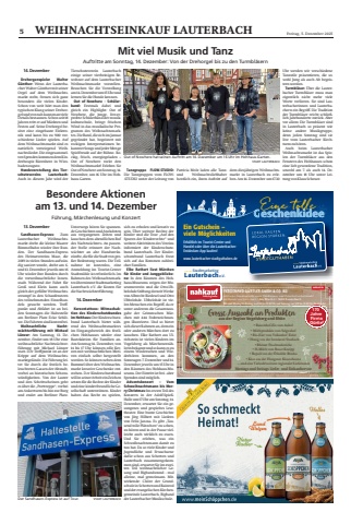 5 WEIHNACHTSEINKAUF LAUTERBACH Freitag, 5. Dezember 2025Druckfehler vorbehalten.Nichts liegtn%u00e4hernahkauf.deFE%u0224%u024c%u023eN%u025a%u0230%u024c G%u00dc%u0224%u0219LE%u0224 %u0241M%u0257%u023f & CO. %u0236%u0241mit Lotto-Annahmestelle sowie Tabakwaren- und Zeitschriftenfachhandelim Herzen von Lauterbach %u2022 Am W%u00f6rth 4 %u2022 36341 LauterbachWir sind Montag bis Freitag von 8.00 bis 18.30 Uhr und Samstag von 8.00 bis 15.00 Uhr f%u00fcr dich da!GrosseAuswahl anProduktenaus der Region Vogelsberg und Rh%u00f6n%u2022 Bauernhof-Eis vom Auhof%u2022 Milchprodukte vom Selgenhof%u2022 Bio-Eier vom Vulkanhof Euler%u2022 Honig von der Immkerei Staubach%u2022 Rh%u00f6ner Fruchtaufstriche%u2022 H-Milch vom Bauer Kneipp%u2022 Raps%u00f6l von der %u00d6lm%u00fchle Rimlos%u2022 K%u00e4se aus der Hungener K%u00e4sescheune... und eine Vielzahl weiterer regionaler LieferantenMontags und freitags Liefer- und Einkaufservice170JahreFirmaG%u00fcrtlerLauterbache.V.Stadtmarketing8.-10. und 15.-17Geschenkidee Geschenkidee G. DEine to%u0196eezemberEin Gutschein %u2013viele M%u00f6glichkeitenErh%u00e4ltlich im Tourist-Center undHandel oder %u00fcber die LauterbacherEntdecken-App kaufen!www.lauterbacher-stadtguthaben.de14. DezemberDrehorgenspieler WalterG%u00fcnther: Wenn der Lauterbacher Walter G%u00fcnther mit seinerOrgel auf dem Weihnachtsmarkt steht, freuen sich ganzbesonders die vielen Kinder.Schon von weit h%u00f6rt man dentypischen Klang seiner Drehorgel und von nah kann man vieleDetails bestaunen. Schon seit 18Jahren tritt er auf M%u00e4rkten undFesten auf. Seine Drehorgel besitzt eine eingebaute Elektronik und kann bis zu 900 verschiedene Lieder spielen. Aufdem Weihnachtsmarkt sind esnat%u00fcrlich vorwiegend Weihnachtslieder. Die eingesammelten Spenden kommen dem Kinderhospiz B%u00e4renherz in Wiesbaden zugute.Hundevorstellung des Tierschutzvereins Lauterbach:Auch in diesem Jahr wird derTierschutzverein Lauterbacheinige seiner vierbeinigen Bewohner auf dem LauterbacherWeihnachtsmarkt vorstellen.Besuchen Sie die Vorstellungam 14. Dezember um 15 Uhr undlernen Sie die Hunde kennen. Out of Nowhere - Sch%u00fclerband: Erstmals dabei undgleich ein Highlight: Out ofNowhere, die junge, live-erprobte Sch%u00fclerband der musikkulturschule, bringt frischenWind in das musikalische Programm des Weihnachtsmarktes. Die Band, die sich im Januargegr%u00fcndet hat, begeistert mitrockigen Interpretationen bekannter Songs und jeder MengeSpielfreude auf der B%u00fchne. Rockig, frisch, energiegeladen %u2013Out of Nowhere rockt denWeihnachtsmarkt! Erleben SieOut of Nowhere am Sonntag, 14.Dezember, um 16 Uhr im Hohhaus-Garten.Tanzgruppe FLOW.STUDIO:Die Tanzgruppen vom FLOW-.STUDIO unter der Leitung vonPatricia Molz laden alle Tanzund Weihnachtsliebhaberherzlich ein, ihren Auftritt aufdem diesj%u00e4hrigen Weihnachtsmarkt in Lauterbach zu erleben. Am 14. Dezember um 17.30Uhr werden wir verschiedeneTanzstile pr%u00e4sentieren, die sowohl Jung als auch Alt begeistern werden.Turmbl%u00e4ser: %u00dcber die Lauterbacher Turmbl%u00e4ser muss maneigentlich nicht mehr vieleWorte verlieren. Sie sind Lauterbacherinnen und Lauterbachern ein Begriff. Die Traditionder Turmbl%u00e4ser reicht schlie%u00dflich Jahrhunderte zur%u00fcck. Abervor allem: Die Turmbl%u00e4ser sindin Lauterbach so pr%u00e4sent wiekeine andere Musikgruppe,denn jeden Sonntag sind sielive vom Lauterbacher Kirchturm zu h%u00f6ren. Auch beim LauterbacherWeihnachtsmarkt ist das Spielen der Turmbl%u00e4ser aus denFenstern des Hohhauses schoneine lieb gewordene Tradition,sowohl am 7. als auch 14. Dezember um 18 Uhr unter Leitung von Klaus Scheuer.Mit viel Musik und TanzAuftritte am Sonntag, 14. Dezember: Von der Drehorgel bis zu den Turmbl%u00e4sernOut of Nowhere hat seinen Auftritt am 14. Dezember um 16 Uhr im Hohhaus-Garten.STADT LAUTERBACH13. DezemberSandhasen-Express: ZumLauterbacher Weihnachtsmarkt dreht die kleine MaarerBimmelbahn wieder ihre Runden. Der Sandhasen-Expressdes Heimatvereins Maar, die2019 in vielen Stunden aufw%u00e4ndig saniert wurde, dreht am 6.und 13. Dezember jeweils um 16Uhr wieder ihre Runden durchdie vorweihnachtliche Innenstadt. W%u00e4hrend der Fahrt f%u00fcrGro%u00df und Klein kann auchgleich der gef%u00fcllte Weihnachtsstrumpf in den Schaufensterndes teilnehmenden Einzelhandels gesucht werden. Treffpunkt und Abfahrt ist an beiden Sonntagen die Haltestelleam Berliner Platz Ecke Sehl%u00f6we. Die Fahrten sind kostenfrei.Weihnachtliche Nachtw%u00e4chterf%u00fchrung mit MichaelL%u00fcnzer: Am Samstag, 13. Dezember, findet um 18 Uhr eineweihnachtliche Nachtw%u00e4chterf%u00fchrung mit Michael L%u00fcnzerstatt. Der Treffpunkt ist an derKrippe auf dem Weihnachtsmarktgel%u00e4nde. Die F%u00fchrung leitet Sie durch die festlich beleuchteten Gassen der Altstadt,vorbei an historischen Sehensw%u00fcrdigkeiten. Von der Lauterund den Schrittscheinen gehtes %u00fcber die %u201ePorttreppe%u201c, vorbeiam Ankerturm bis hin zur Burgund endet am Berliner Platz.Unterwegs h%u00f6ren Sie spannende Geschichten und Anekdotenaus vergangenen Zeiten undlauschen dem abendlichen Rufdes Nachtw%u00e4chters. An passender Stelle erinnert der Nachw%u00e4chter an alte Handwerksz%u00fcnfte, die f%u00fcr die Stadt von gro%u00dfer Bedeutung waren. Die Teilnahme ist kostenlos, eineAnmeldung im Tourist-CenterStadtm%u00fchle ist erforderlich. ImRahmen des Weihnachtsmarktes %u00fcbernimmt StadtmarketingLauterbach e.V. die Kosten f%u00fcrdie Nachtw%u00e4chterf%u00fchrung. 14. DezemberKerzentattoos: Mitmachaktion des Kinderschutzbundesim Hohhaus: Der Kinderschutzbund Lauterbach bietet w%u00e4hrend des Weihnachtsmarktesim Eingangsbereich des festlichen Hohhauses wieder eineBastelaktion f%u00fcr Familien an.Am Sonntag 14. Dezember, von14 bis 17 Uhr k%u00f6nnen edle Kerzen mit weihnachtlichen Motiven einfach selbst hergestelltwerden. So k%u00f6nnen neben demBummel %u00fcber den Weihnachtsmarkt kreative Geschenke entstehen. Der Kinderschutzbundwill in seiner Arbeit ein Zeichensetz
